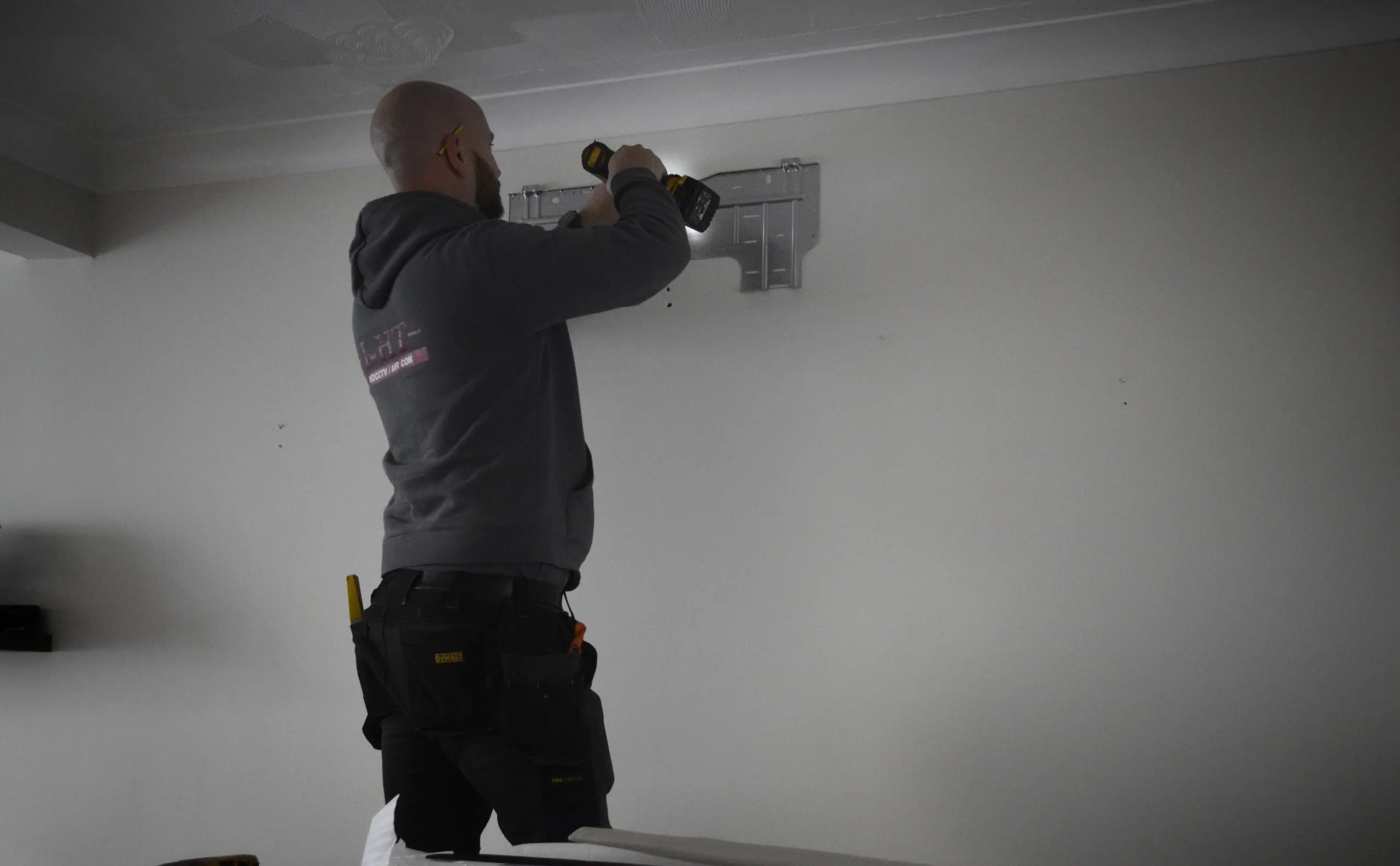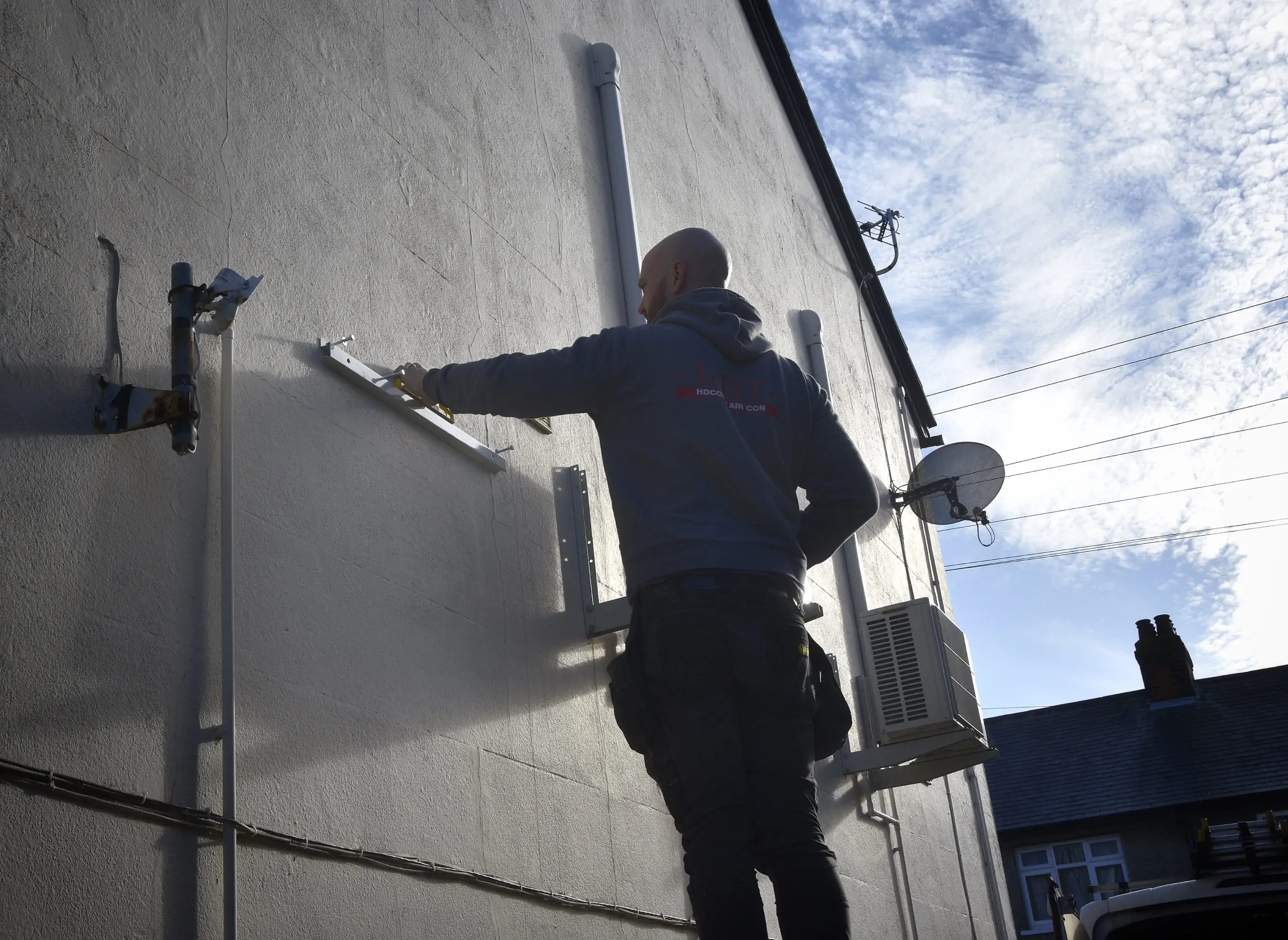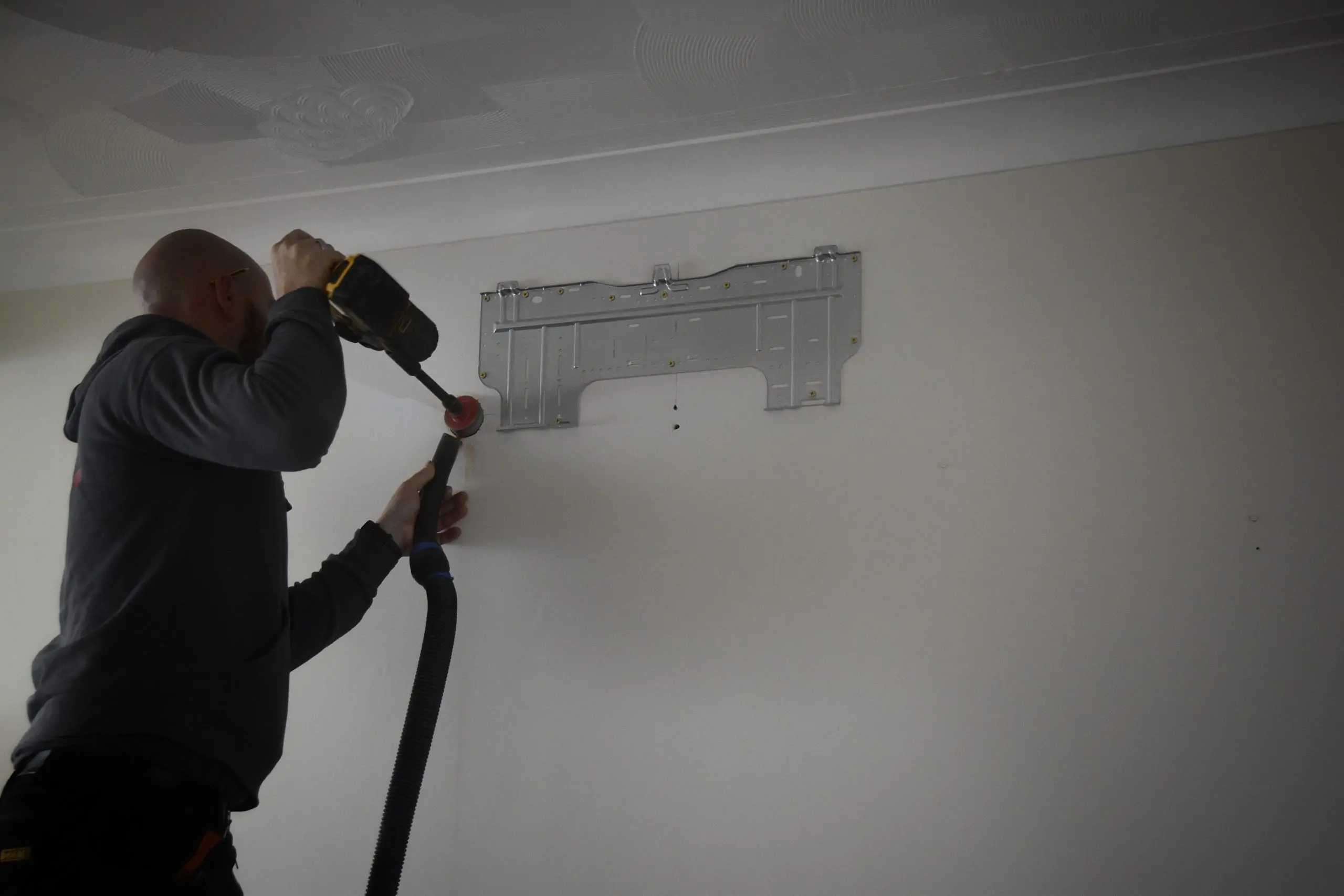 A 65–75 mm hole is drilled through the wall to route the refrigerant pipes, condensate drain, and cables. The hole is angled slightly downward to allow condensation to drain naturally. Dust extraction or containment should be used where possible to maintain safe working conditions and minimise disruption.